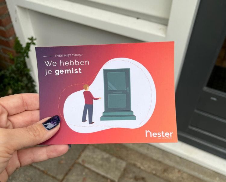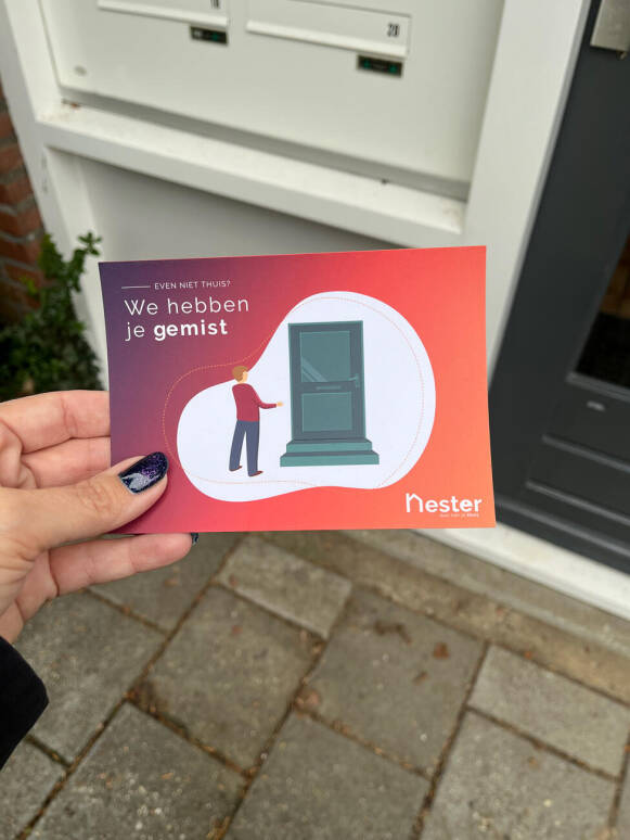 In dit zelfde complex bel ik aan bij een bewoner met wie we geen contact krijgen en die huurachterstand heeft. Omdat de persoon niet thuis is, laat ik een kaartje achter met het verzoek om contact op te nemen. Het is belangrijk dat we in gesprek blijven, zeker bij huurachterstand. Zo voorkomen we dat schulden oplopen!