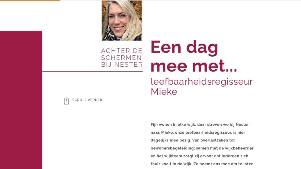 Fijn wonen in elke wijk, daar streven we bij Nester naar. Mieke, onze leefbaarheidsregisseur, is hier dagelijks mee bezig. Van overlastzaken tot bewonersbegeleiding; samen met de wijkbeheerder en het wijkteam zorgt zij ervoor dat iedereen zich thuis voelt in de wijk. Ze neemt ons mee om te laten zien dat voor haar geen dag hetzelfde is.